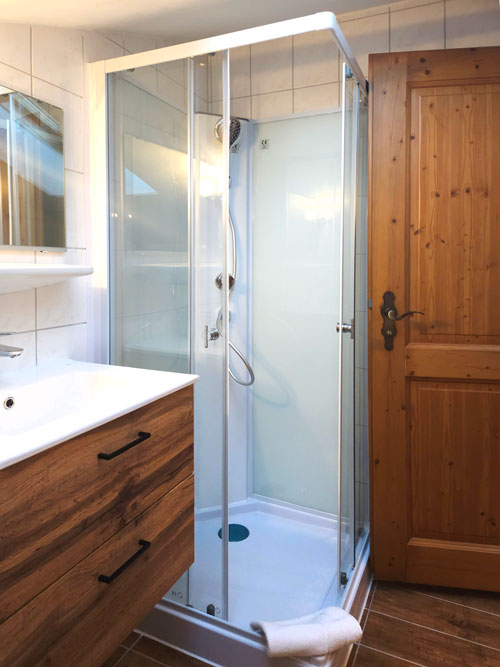 Schlafzimmer mit Doppelbett Sitzgelegenheit Dusche / Waschbecken / Föhn Fernseher